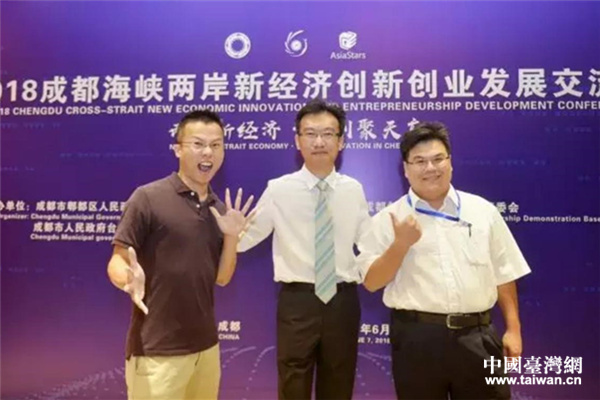 臺青創業團隊來蓉參加交流會,(中)為簡名駿。(圖片來源:四川省臺辦)