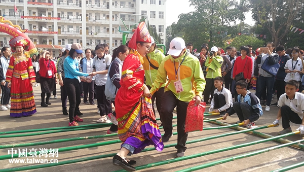 剛進校園,臺灣同胞就被前來歡迎的數十條首尾相連舞龍隊伍所吸引,紛紛與彩龍合影留念,隨后,身著艷麗民族服裝的學生陪同他們到學校操場體驗跳竹竿、滾鐵環、拋繡球等民族體育活動。熱情的壯校學生主動上前牽著臺灣同胞一起跳竹竿,又手把手傳授他們滾鐵環、拋繡球的技巧,一時間操場上就成了歡樂的海洋。