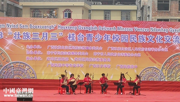 表演交流在雄壯的馬山壯族會鼓鼓聲和彩龍翻騰中拉開了帷幕,廣西師生們表演的廣西民族特色節目《園中芭蕉樹》、《千古駱越祭祖山》、《歌妹情意長》,與臺灣師生們表演的《戰馬奔騰》、《獅子鼓曲》交相輝映,博得現場觀眾的陣陣掌聲。表演情到濃時,桂臺青少年在舞臺上手牽手、肩并肩,一同跳起多耶舞,高唱民族團結和諧歡歌。