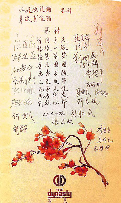 這份菜單十分“別致”——中間文字部分是四個字的“菜名”,上方可見主賓信息,下方有日期落款“27-4-1993”,左右兩側(cè)有許多賓客的簽名。