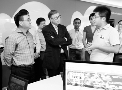 這是李冠志(右一)特意提供的一張照片,顯示2014年6月,他向比爾·蓋茨介紹公司的產品。