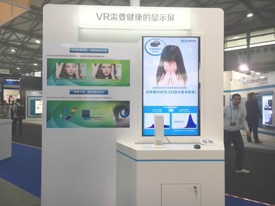 同時,和輝光電向來訪者展示了健康護眼顯示屏與VR產品的必要聯系。健康護眼的AMOLED顯示屏與電子產品息息相關。高能藍光普遍存在于所有的LED/LCD光源設備中,包括日常使用的手機等電子通訊設備,也包括當下正熱的VR設備。直接暴露在高能藍光之下的人眼會受到不同程度的損傷。和輝光電一如既往地關注AMOLED顯示屏產品的健康領域,并在現場設置了藍光光譜測試儀供來訪者測試及體驗,旨在提高用戶對于健康護眼的關注度。