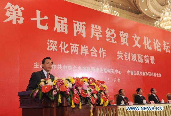 Wang Yi (L), director of the Taiwan Work Office of the Communist Party of China Central Committee, addresses the conclusion ceremony of the Cross-Strait Economic, Trade and Culture Forum, a regular forum between the Chinese mainland and Taiwan, in Chengdu, capital of southwest China's Sichuan Province, May 8, 2011. Jia Qinglin, member of the Standing Committee of the Political Bureau of the Communist Party of China (CPC) Central Committee, and Kuomintang (KMT) honorary chairman Wu Poh-hsiung attended the ceremony Sunday. (Xinhua/Rao Aimin)