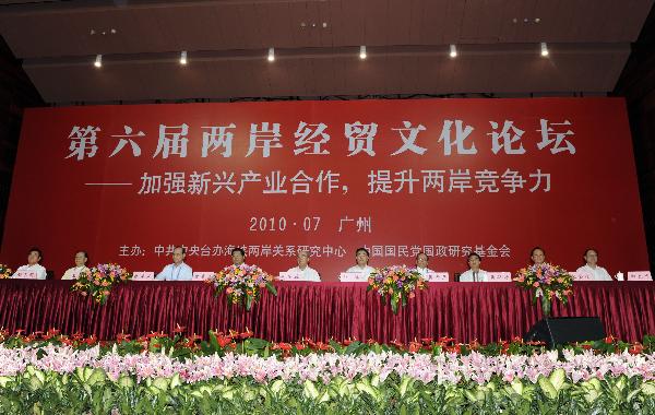 The sixth Cross-Strait Economic, Trade and Culture Forum kicks off in Guangzhou, south China's Guangdong Province, July 10, 2010. Jia Qinglin, chairman of the National Committee of the Chinese People's Political Consultative Conference, and Wu Poh-Hsiung, honorary chairman of the Chinese Kuomintang (KMT), attended the opening ceremony. (Xinhua/Guo Lei)