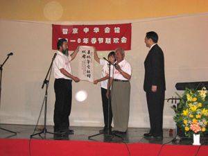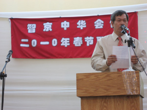 呂凡大使和智京中華會館主席胡金維先生分別在晚會上發表講話,盛贊建國60周年特別是改革開放30多年來中國取得的輝煌成就,衷心祝愿我們偉大的祖國日益繁榮昌盛,祝所有旅智華僑、華人身體健康、生意興隆、闔家幸福、虎年大吉。