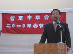 呂凡大使和智京中華會館主席胡金維先生分別在晚會上發表講話,盛贊建國60周年特別是改革開放30多年來中國取得的輝煌成就,衷心祝愿我們偉大的祖國日益繁榮昌盛,祝所有旅智華僑、華人身體健康、生意興隆、闔家幸福、虎年大吉。