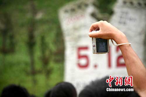 華裔青少年在“5.12”地震紀(jì)念碑前拍照留影。 作 者:張浪