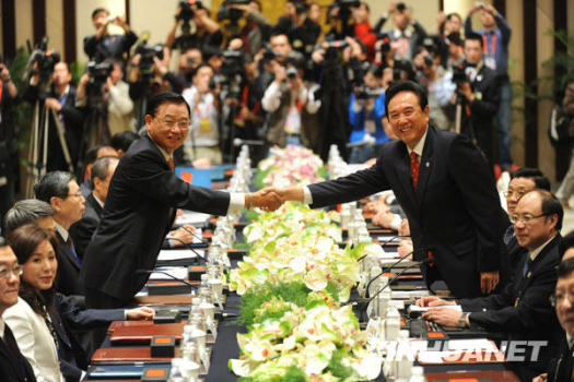 4月26日上午,海峽兩岸關系協會會長陳云林與海峽交流基金會董事長江丙坤在南京舉行會談。這是兩會恢復協商后領導人第三次會談。新華社記者 韓瑜慶攝