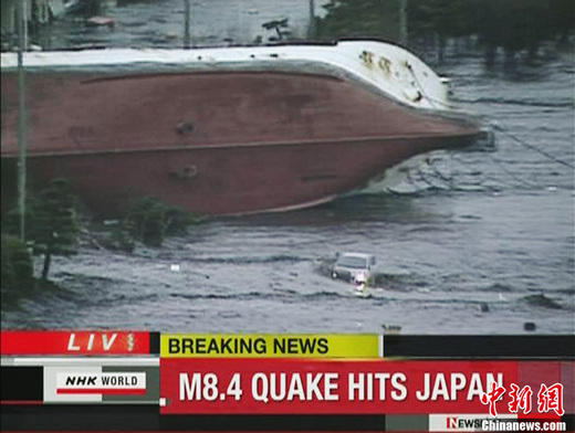 日本近海3月11日發生了強烈地震,首都東京震感強烈。日本氣象廳隨即發布了海嘯警報,稱地震將引發約6米高海嘯。圖為NHK電視臺截圖顯示青森縣八戶市港口的貨船被海嘯掀翻。