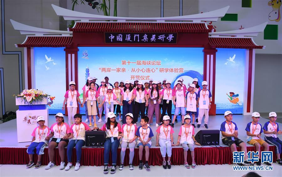 6月14日,兩岸小朋友在開幕式上共同演唱歌曲《我們都是一家人》。當日,第十一屆海峽論壇“兩岸一家親·從小心連心”研學體驗營在福建廈門開營,來自兩岸的青少年將在三天的時間里,在研學總部同吃、同住、同玩、同交流、同分享。 新華社記者 林善傳 攝