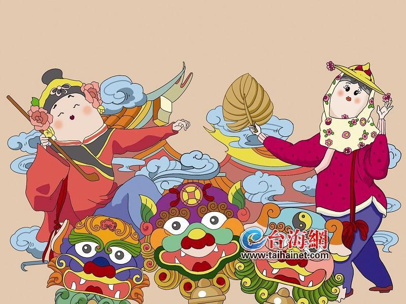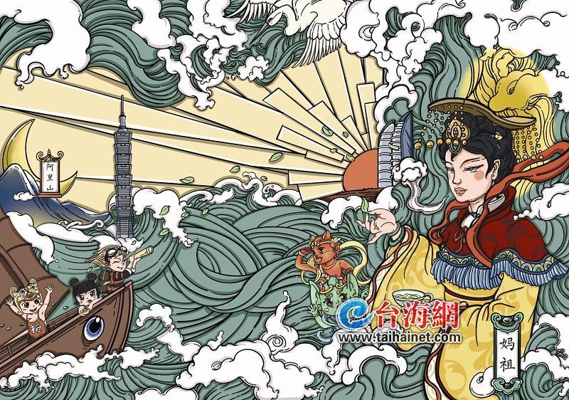 作品繪制了閩南漁女、風(fēng)獅爺、媒人丑角,分別代表了閩臺民俗文化、信仰文化、戲劇文化。以祥云裊裊和特色建筑作為背景,從各方面展現(xiàn)了豐富多彩、同根同源的閩臺風(fēng)情。