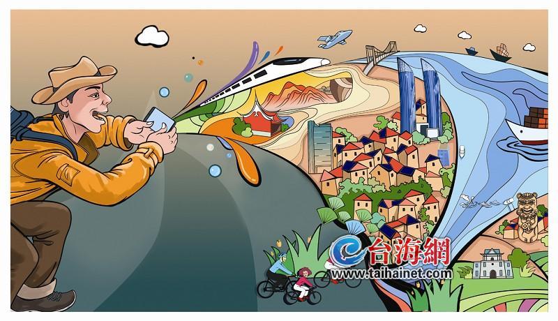 以“閩臺一日生活圈”為創(chuàng)作靈感,畫面左側(cè)是往返于兩岸的游客,在這全民“拍、拍、拍”的打卡時代背景下,以游客視角領(lǐng)略海峽兩岸的滄桑巨變。畫面右邊,則有高鐵、單車、廈門雙子塔、金門莒光樓、海運、海豚等代表性元素。