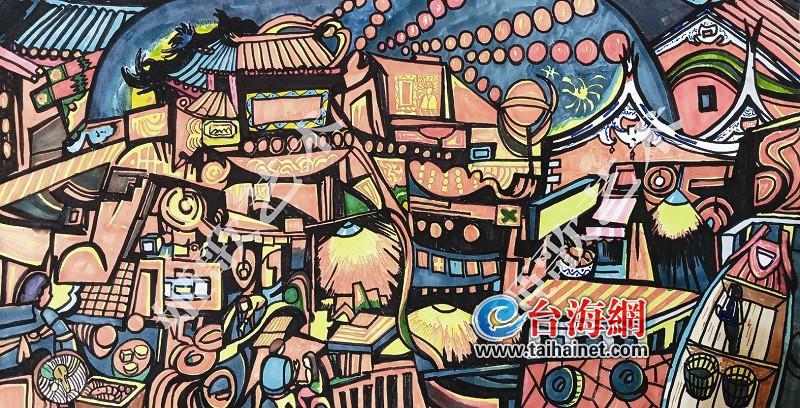 采用立體派的繪畫風(fēng)格,組合了兩岸夜市的景象。熱鬧的攤位、高懸的燈籠、矗立的牌樓、參差的建筑、夜歸的船只……同樣的習(xí)俗,同樣的生活方式,同樣的人間煙火,同樣的打動人心。