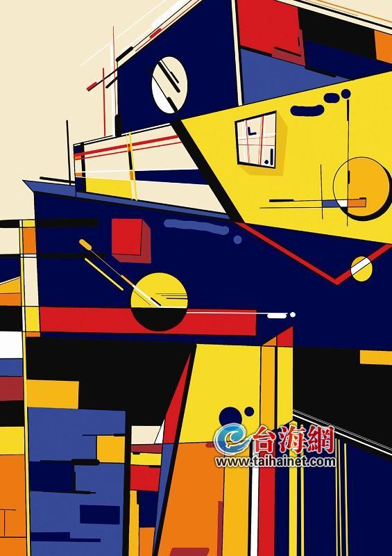 集裝箱是兩岸港口常見的意象,也是當(dāng)今快節(jié)奏生活的縮影。在這幅作品中,它們不再是堅硬而冰冷的、抽象化的色塊,色彩熱烈而富有生機,冷與暖交織,表達(dá)兩岸青年新思想與生活激情的碰撞。
