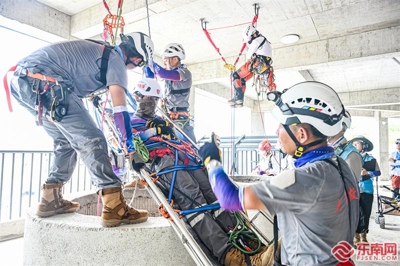 繩索救援比賽現(xiàn)場選手們爭分奪秒比拼。