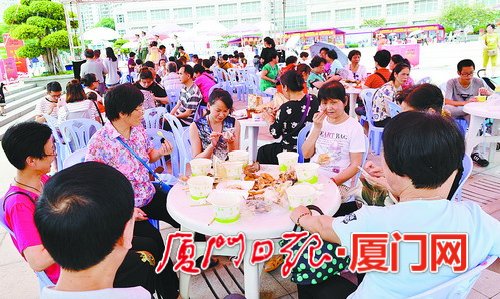 昨天上午10時許,海滄市民文化廣場上,來自兩岸的特色美食香味四溢,紅、黃兩色帳篷下,到處人頭攢動,熱鬧非凡。眾多市民游客聞訊而來,競相品嘗來自臺灣的地道美食。據介紹,本屆廟會共設攤位210個,其中170家來自臺灣,覆蓋臺灣21個縣市,規模之大超越往屆。