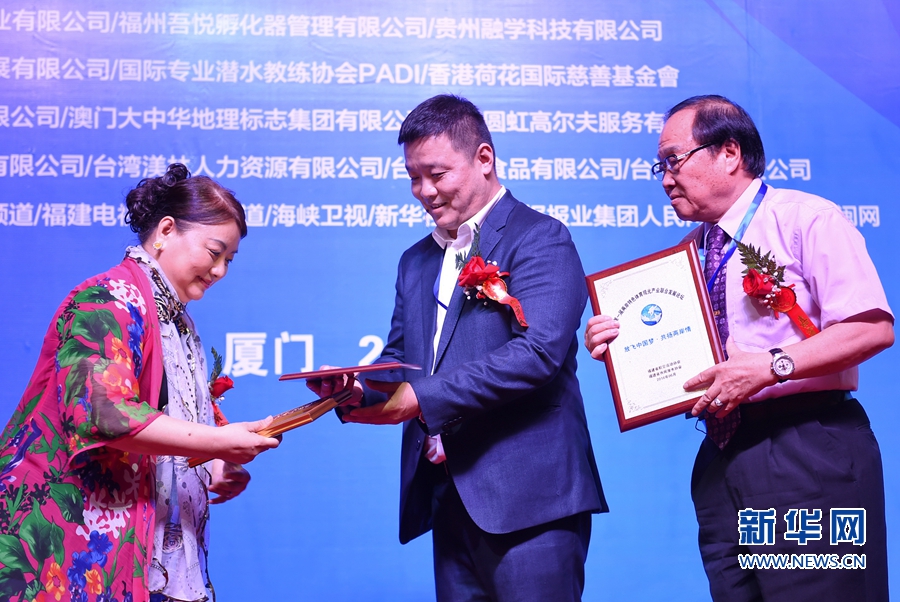 6月12日,福建省航空運動協會會長杜錦恩(中)與臺灣嘉賓王譽茹(左)、李镕任在論壇上互贈紀念品。新華社記者林善傳攝
