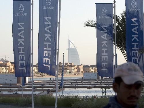 12月14日,阿聯酋納希勒公司的旗幟在朱邁拉棕櫚島上飄揚。納希勒是迪拜世界集團旗下的房地產公司。當天,阿聯酋迪拜政府發表聲明說,阿布扎比已決定向迪拜提供100億美元援助資金,用以支付迪拜世界集團的部分債務,幫其渡過債務危機。 新華社/路透