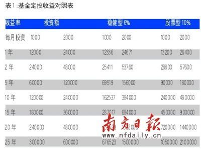 表1是按照基金定投的方式,每月分別準(zhǔn)備1000元、2000元,按照收益率6%和10%計(jì)算得到的實(shí)際收益,大家可以對(duì)照下自己適合那種投資方式,以及需要準(zhǔn)備的年限籌劃自己的退休養(yǎng)老金。