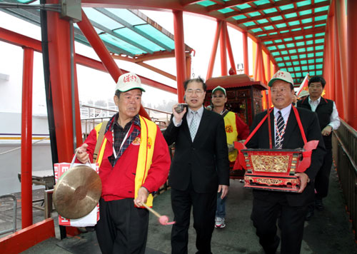 中新網4月11日電 據“中央社”報道,金門縣烈嶼鄉保生大帝進香團,11日經由“小三通”前進大陸祖廟謁祖交流,金門縣長李沃士到碼頭為神明抬轎送行,祈祝庇佑平安。