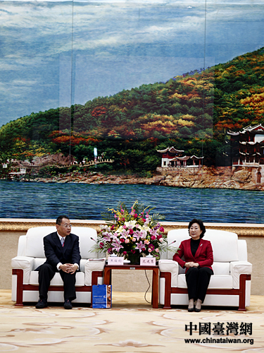 今天上午,安徽省副省長花建慧在馬鞍山會見了參加海峽兩岸電子信息博覽會的兩岸嘉賓。(中國臺灣網 王偉 攝)