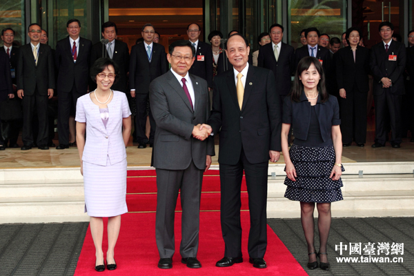 中國臺灣網6月20日上海消息 出席第九次兩岸兩會領導人會議的海基會董事長林中森(前右二)一行今日中午抵達上海,海協會會長陳德銘(前左二)及相關人員在上海東郊賓館歡迎海基會協商代表團的到來。(中國臺灣網 于斯文 攝)