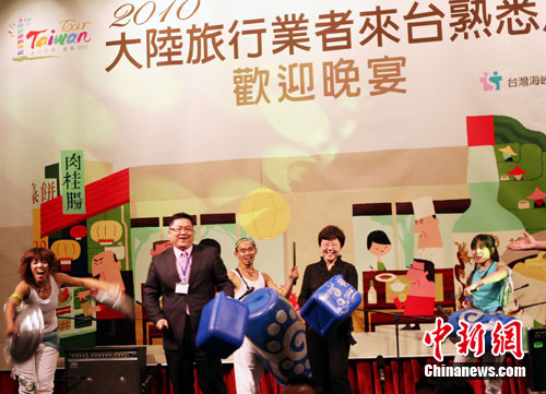 12月3日,大陸新增6省區(qū)赴臺游的旅游業(yè)者組團訪臺踩點,臺灣海峽兩岸觀光旅游協(xié)會及臺灣旅行業(yè)界為此在臺北舉行晚宴歡迎。自2010年7月18日起,內(nèi)蒙古、西藏、甘肅、青海、寧夏、新疆6省區(qū)新增為大陸居民赴臺旅游的開放區(qū)域。圖為踩點團團長、大陸海峽兩岸旅游交流協(xié)會副秘書長李亞瑩與臺灣海峽兩岸觀光旅游協(xié)會副會長劉喜臨在晚宴上共同擊鼓助興。中新網(wǎng)發(fā) 黃少華 攝