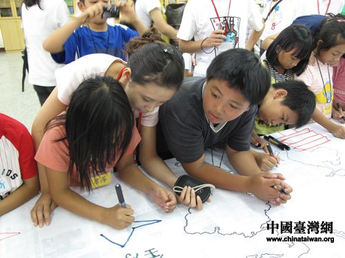 7月22日,廣西大學(xué)和臺(tái)灣大學(xué)學(xué)生和臺(tái)灣南投縣信義鄉(xiāng)仁和小學(xué)學(xué)生共畫“心目中的世博場館”。圖片來源:廣西臺(tái)辦