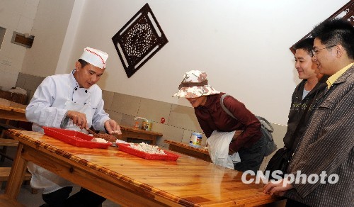 11月2日,福建沙縣小吃知名品牌廟門扁肉第三代傳承人王盛標在沙縣小吃城內為慕名前來的賓客表演“超快”手工包扁肉的絕活。福建省三明市沙縣,雖然土地面積不大,人口不多,但是卻因為當地小吃,而名揚海內外。 中新社發 劉可耕 攝