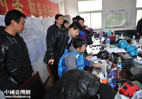 高振生等領導在搜救指揮部聽取有關部門情況匯報。(北京通訊員 丁磊 攝)