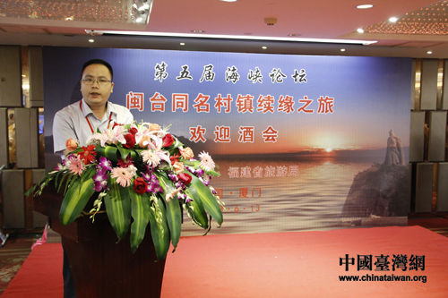 來自福建泉州市晉江安平鎮(zhèn)的代表張勝利在“閩臺同名鄉(xiāng)鎮(zhèn)續(xù)緣之旅啟動儀式”上致詞(中國臺灣網(wǎng)記者 蕪?fù)?攝)