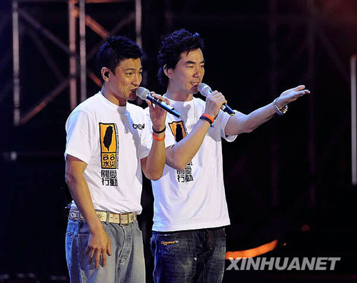 8月17日,在香港舉行的賑災義演中,香港藝人劉德華(左)和臺灣藝人任賢齊演唱《世界第一等》。新華社記者陳鐸攝