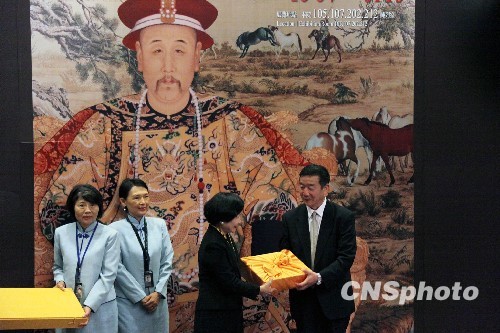 10月6日,北京故宮博物院院長鄭欣淼向臺北故宮博物院致贈《清乾隆朝清文大藏經(jīng)》,臺北故宮院長周功鑫回贈《清康熙朝藏文龍藏經(jīng)》。兩岸故宮60年來首度合辦的展覽“雍正——清世宗文物大展”,7日將在臺北故宮博物院開展,這是兩岸故宮開啟“務實交流”后,交出的首張亮眼的成績單。中新社發(fā) 黃少華 攝