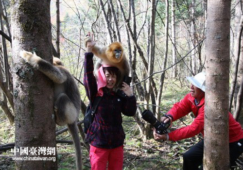 采風(fēng)團(tuán)成員與金絲猴互動。(神農(nóng)架林區(qū) 吳太地 攝)