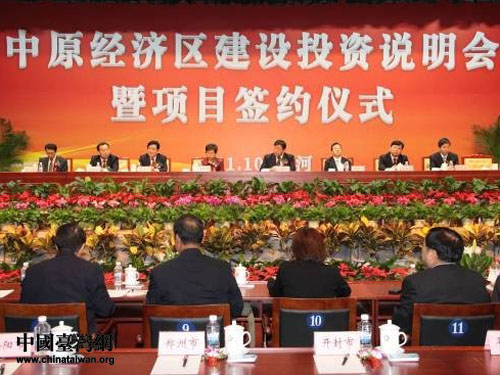 “2011豫臺經貿洽談會暨臺商中原行”之中原經濟區建設投資說明會暨項目簽約儀式在河南漯河舉行。(圖片來源:河南省臺辦)