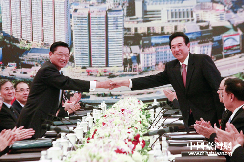兩岸兩會領(lǐng)導(dǎo)人第七次會談于20日上午9時在天津迎賓館舉行,海協(xié)會會長陳云林與臺灣海基會董事長江丙坤握手致意。(中國臺灣網(wǎng) 陳佳慧 攝)
