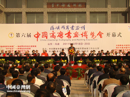 中國臺灣網10月25日聊城消息 10月18日至24日,第六屆中國(高唐)書畫博覽會暨海峽兩岸書畫作品大型聯展活動在山東省聊城市高唐縣成功舉辦。山東省人大常委會原副主任董鳳基、省文化廳巡視員邢玉斗、省委臺辦副巡視員莊衛平、省文聯副主席楊楓、聊城市委副書記劉加順等領導出席開幕式,海峽兩岸經濟文化交流協會會長徐東萌及臺灣著名畫家李奇茂等兩岸書畫界名家應邀參加。