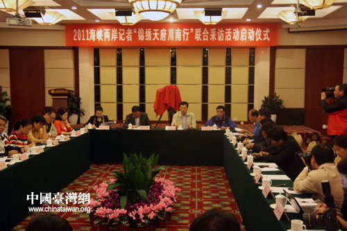 中國臺灣網9月21日成都消息 今天下午,由四川省臺辦主辦的2011海峽兩岸記者“錦繡天府川南行”聯合采訪活動在四川成都正式拉開帷幕。包括中國臺灣網、中央人民廣播電臺、中新社、《兩岸關系》雜志,臺灣中時集團《時代周刊》、臺灣新聞報、貓貍電臺、臺灣商報、臺灣網訊報、高雄市新聞記者公會以及香港文匯報在內的兩岸三地20家媒體、30余名記者參加了啟動儀式。