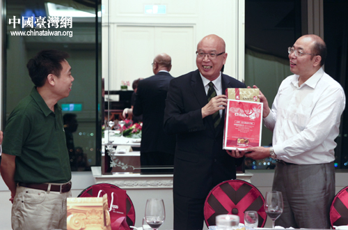 康師傅集團華北地區(qū)董事長張百清在臺北101大樓會見“康師傅橋——大陸網絡媒體高層赴臺交流參訪團”一行,圖為雙方互贈禮物。(中國臺灣網 陳佳慧 攝)