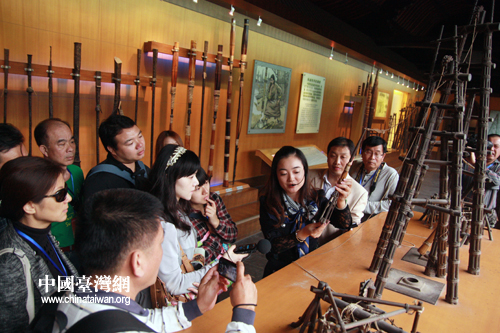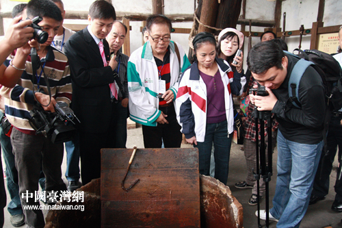 兩岸記者在自貢鹽業歷史博物館里參觀古代井鹽工具。(中國臺灣網 馬迪 攝)