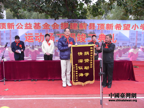 頂新希望小學王學文校長代表全校師生向頂新基金會回贈了感謝錦旗,上書“捐資助學 情深似海” (中國臺灣網記者 蕪同攝)