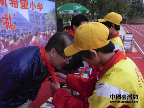 在新落成的運動場上,學校的小朋友為頂新公益基金會理事長騰鴻年戴上了紅領巾(中國臺灣網記者 蕪同攝)