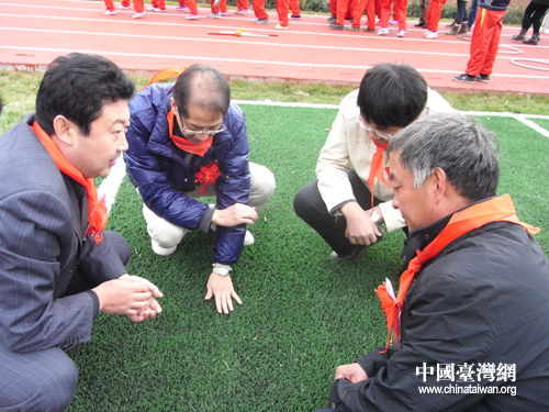 頂新公益基金會理事長騰鴻年與鄉鎮負責人及小學校長一起查看人造草坪足球場質量(中國臺灣網記者 蕪同攝)