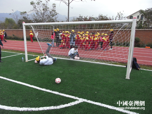 這個頂新的大哥哥吹牛說自己守門是鐵門,“鐵門”大哥哥在小朋友們的八方進攻下,終于在撲救一個刁鉆射門時,摔了個四腳朝天,逗的小朋友們哈哈大笑(中國臺灣網記者 蕪同攝)