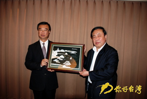閻啟俊書記向吳伯雄榮譽主席贈送青島貝雕工藝品(你好臺灣網 圖)