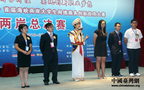 按照賽事規則,來自兩岸各高校的24支團隊依次登臺,進行項目推介,并依評委及觀眾的提問現場答辯。比賽中,兩岸學子在精心推介、流利應答的同時,充分展現出各自的創意與活力。北方民族大學的“e—夢圓”小隊身著民族特色服裝驚艷亮相;臺灣致理技術學院的“釋迦天堂”小隊現場派送釋迦,供評委、觀眾品鑒;西安郵電大學“隨風e起沖”小隊上演古裝穿越;臺灣德明財經科技大學的“橘子工坊 健康工坊”小隊跳起在街邊進行品牌宣傳時的熱舞,贏得現場陣陣喝彩……推介、答辯之余,兩岸選手抓住難得機會,傾心交流。“e—夢圓”小隊極富民族特色的服裝引起臺灣選手的極大興趣,雙方合影留念,并熱絡地交流起各自家鄉的良辰美景、風土人情。