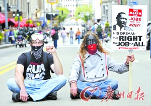2009年9月,美國匹茲堡市中心發生大規模抗議示威活動,抗議者手持爭取就業權利的標語。(資料圖片)