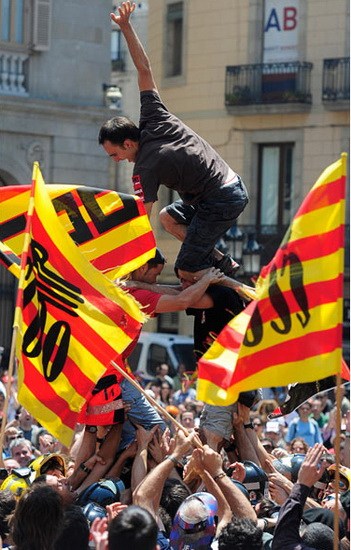 巴塞羅那的罷工,當地工人試圖疊起一座人塔,抗議政府削減開支的緊縮政策。