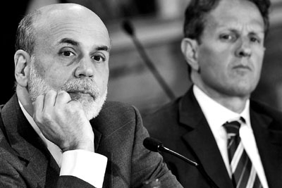 美聯(lián)儲主席伯南克(左)與財長蓋特納出席財政部會議。 圖片來源:香港《文匯報》