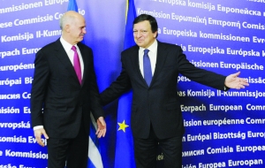 周一晚間開始,歐元區(qū)和歐盟各國財長將在布魯塞爾召開會議,商討下一步的救市行動,以彌合歐洲各國目前存在的較大分歧。圖為歐盟委員會主席巴羅佐(右)在會前歡迎希臘總理帕潘德里歐。